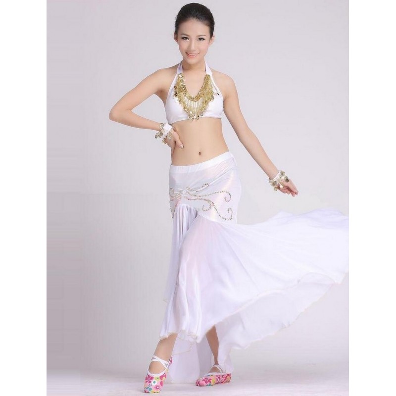 Composé d'un top à nouer et d'une jupe sirène à paillettes or.